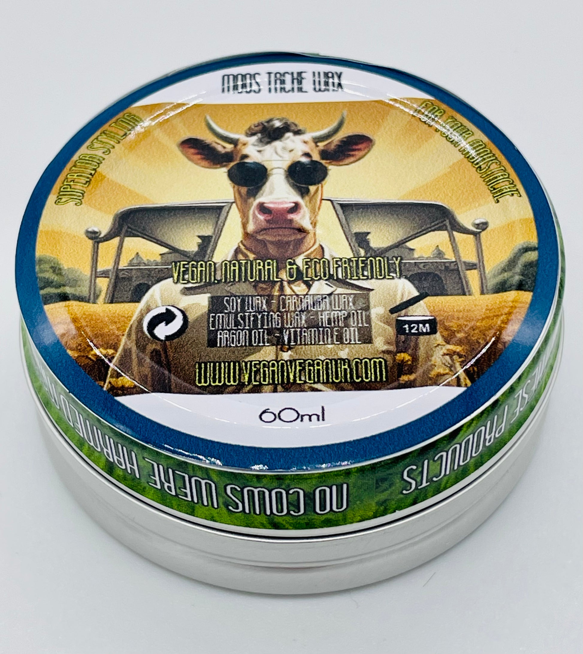 Introducing "Our Moostache Wax," the vegan, eco-friendly, organic, and natural wonder that will transform your upper lip game into a spectacle worth mooing about! This moustache wax is all about bringing out the rock star in you, making you moo like Jagger. Crafted with the finest plant-based ingredients, it offers unrivaled hold, taming even the wildest of 'stache beasts. Whether you're aiming for a dapper handlebar or a fierce fu Manchu, "our moustache wax " has got your back (and your lip). Embrace the sustainable and ethical choice for your facial hair, and watch as your moustache becomes the envy of all barnyard creatures. So go ahead, unleash your inner rock star and let your moustache steal the show with our Moo-stache Wax"!